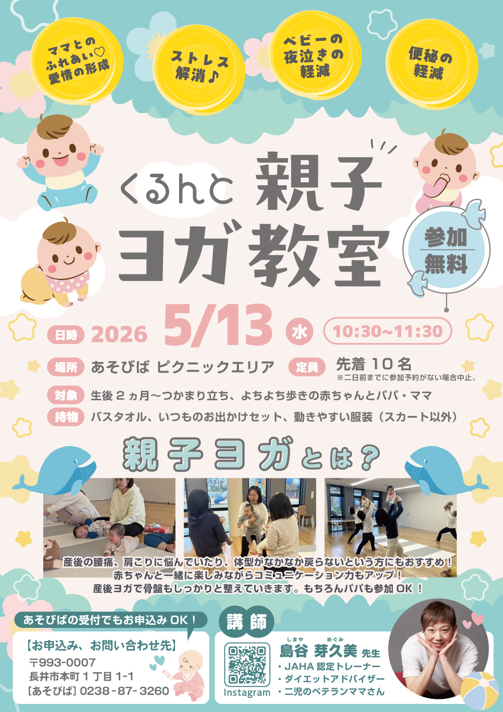 ベビーマッサージ・ベビーヨガや親子ヨガ、ママヨガ(骨盤調整やセルフケアの指導)などを通じて、ご自宅でもできる簡単な指導も受けられます!